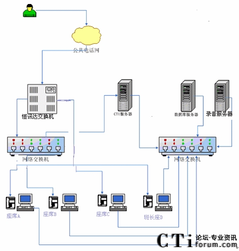 根據(jù)以上業(yè)務(wù)設(shè)計框架,我們確定了客服中心搭建時所需要的設(shè)備,系統(tǒng)的網(wǎng)絡(luò)拓?fù)浣Y(jié)構(gòu)圖如下: