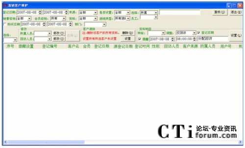 注:對(duì)于登記日期一直到客戶名這一段條件的查詢(即上圖中所有的那些查詢條件),都得點(diǎn)擊客戶名欄對(duì)應(yīng)的那個(gè)查找按鈕才能進(jìn)行有效的查找,否則若點(diǎn)擊其它按鈕(姓名電話直接檢索對(duì)應(yīng)的查找除外),都會(huì)提示“請(qǐng)輸入****”這種錯(cuò)誤信息。而點(diǎn)擊最后一個(gè)查找,也是無效的,會(huì)轉(zhuǎn)到客戶管理中空白信息欄(即什么也查不到)。