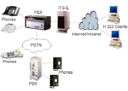 計(jì)算機(jī)IP電話產(chǎn)品,類似網(wǎng)絡(luò)會議系統(tǒng),允許用戶使用他們當(dāng)前的IP聯(lián)接把通話接到電腦上去(如通過以太網(wǎng)聯(lián)接到他們的局域網(wǎng)中)。這種作法的局限是PC用戶只可以與另一PC用戶通話。然而,使用ITS-E,這種局限將不存在。任何在網(wǎng)絡(luò)上的PC可使用H.323(用于IP電話上的ITU-T標(biāo)準(zhǔn))軟件包來實(shí)現(xiàn)通話,如微軟的網(wǎng)絡(luò)會議系統(tǒng),通過ITS-E服務(wù)器通至一個(gè)常規(guī)的電話使用者。電話用戶不需要任何新的裝備,甚至不會意識到聲音是從PC機(jī)中傳出及在IP網(wǎng)絡(luò)中傳輸。示意圖如下: