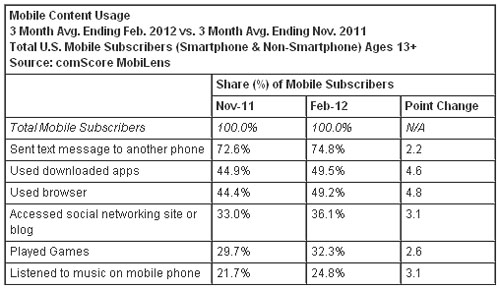 按截至今年2月份的三個月的平均數(shù)計算,美國手機用戶中有74.8%的用戶利用手機發(fā)送短信,相比截止去年11月的三個月上升2.2個百分點;有49.5%的用戶使用了下載的應(yīng)用程序(上升4.6個百分點),有49.2%的用戶使用瀏覽器(上升4.8個百分點),有36.1%的用戶訪問社交網(wǎng)站或博客(上升了3.1個百分點);有32.3%有用戶利用手機玩游戲(上升2.6個百分點),有24.8%的用戶利用手機聽音樂(上升3.1個百分點)。
