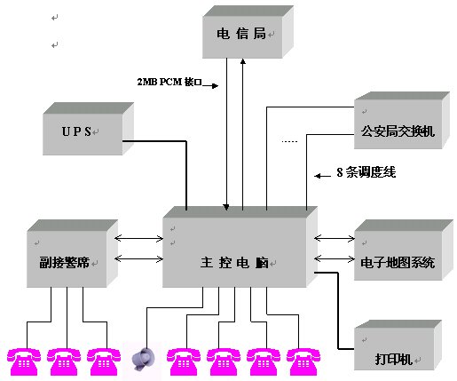 電信局交換機提供單獨數(shù)字2MB PCM中繼接口,通過HDSL傳輸設備或光端機設備將中繼接口連接到公安局指揮中心。若電信局與公安局距離小于500米,則可直接使用75歐姆電纜將中繼接口連接到公安局指揮中心。 該數(shù)字2MB PCM中繼接口的數(shù)據(jù)可以作成110/119/122混合編程,數(shù)據(jù)采用收全碼方式,被叫控制掛機。