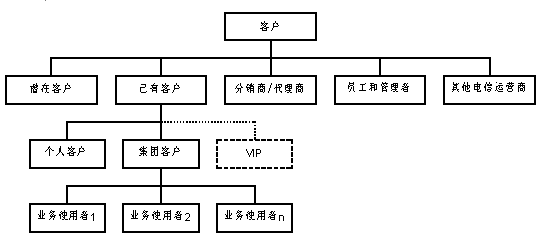 同時,客戶服務(wù)中心的服務(wù)對象進(jìn)一步擴(kuò)大,按照是否已經(jīng)使用該電信運(yùn)營商提供的電信業(yè)務(wù)將客戶劃分為:潛在客戶、已有客戶。這里的潛在客戶并不針對某一具體的電信業(yè)務(wù),而是針對電信運(yùn)營商整體而言。其中,已有客戶又分為個人客戶和集團(tuán)客戶。集團(tuán)客戶內(nèi)部存在多個業(yè)務(wù)使用者,這些業(yè)務(wù)使用者本身也是客服系統(tǒng)的客戶。分銷/代理商代為發(fā)展電信運(yùn)營商的客戶,同時他們也可以單獨(dú)作為一種特殊客戶享有客服系統(tǒng)提供的服務(wù)。在個人客戶和集團(tuán)客戶中,均會有一部分成為特殊的VIP。此外,對客服系統(tǒng)來說,電信運(yùn)營商的員工和管理者也是"客戶";同時,從網(wǎng)間互聯(lián)和網(wǎng)間結(jié)算的角度,其它運(yùn)營商也應(yīng)該按照客戶來對待。