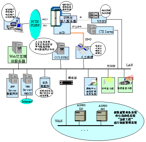 在深圳國稅局方案中,整個系統(tǒng)的建設按三期規(guī)劃進行。第一期的目標主要是搭建呼叫中心平臺,包括ACD(排隊機)、IVR(交互式語音應答系統(tǒng))、CCS(華為呼叫中心中間件)等軟硬件設備。ACD作為整個系統(tǒng)的核心接入設備,采用了華為公司的C&C08-Q排隊機。C&C08-Q是大容量高可靠性的數(shù)字排隊機,通過中國七號信令或ISDN