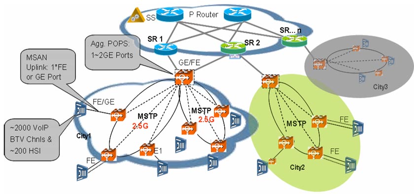 MSAN已經(jīng)逐漸成為基于IP架構(gòu)的下一代電信網(wǎng)建網(wǎng)的主要接入方式,近幾年越來越多的固網(wǎng)運(yùn)營(yíng)商普遍采用綜合接入(MSAN)建網(wǎng)模式,如英國(guó)的最大固網(wǎng)運(yùn)營(yíng)商英國(guó)電信的21CN網(wǎng)絡(luò),中國(guó)的最大固網(wǎng)運(yùn)營(yíng)商中國(guó)電信、中國(guó)網(wǎng)通,巴西的最大固網(wǎng)運(yùn)營(yíng)商Telemar等。而MSTP單一平臺(tái)具備支持MSAN接入的所有業(yè)務(wù)的承載要求,且成本最低。華為公司MSTP設(shè)備具有強(qiáng)大的數(shù)據(jù)接入?yún)R聚及傳送特性,并通過Metro