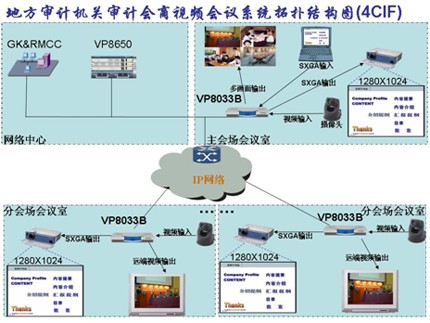 本系統(tǒng)在審計署機房配置網(wǎng)絡控制中心GK、多點資源管理系統(tǒng)和ViewPoint 8660 MCU設備。多點資源管理中心實現(xiàn)對MCU、電視會議和全網(wǎng)資源的統(tǒng)一調(diào)度,GK實現(xiàn)對IP終端入會時鑒權(quán)認證,在主會場會議室架設一臺ViewPoint 8033B分體式視訊終端。在各分會場會議室架設一臺ViewPoint 8033B分體式視訊終端;在所有會場各架設一臺標清攝像機、一個麥克風、一臺高清電視或一臺高清投影機。