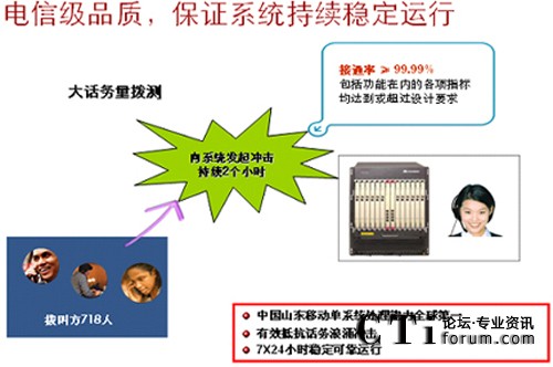華為聯(lián)絡(luò)中心系統(tǒng)具有高穩(wěn)定性、高可靠性、易擴(kuò)展性和可維護(hù)性。這主要源于華為對電信網(wǎng)絡(luò)現(xiàn)狀與演進(jìn)的理解,源于華為擁有固定、移動和IP三個網(wǎng)絡(luò)方面綜合實力。華為數(shù)以千計的核心平臺開發(fā)測試人員,幾十種極端環(huán)境(如超大話務(wù)量、溫差、濕度、鹽堿度、缺氧等),磨礪出的是世界級的高品質(zhì)。麥加朝圣10KM內(nèi)密集200萬移動用戶,大部分為國際漫游,整齊劃一的用戶行為,形成連日多波話務(wù)尖峰,網(wǎng)絡(luò)受不均衡沖擊,系統(tǒng)容易雪崩。使用華為方案STC連續(xù)四年征服HAJJ期間話務(wù)高峰,告別系統(tǒng)每逢朝圣就癱瘓歷史。正是繼承了這樣的DNA,我們在某移動運營商聯(lián)絡(luò)中心系統(tǒng)單點實測BHCC1200K,每天平均呼叫量為600萬次,一套系統(tǒng)支撐著2000多座席和近8000路IVR。