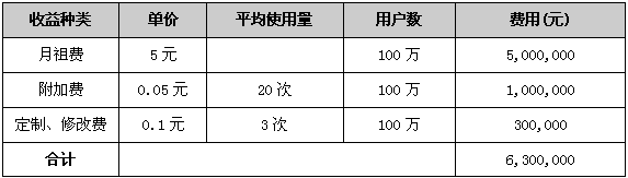 根據(jù)以上所述,假如用戶數(shù)為100萬,CRBT月租費為5元,并提供20次的免費呼叫,之上每次呼叫收取0.05元假若每月附加呼叫為平均20次,即每月用戶平均收到40次呼叫。且每用戶每月至少定制或修改三條CRBT,每次收費0.1元。
