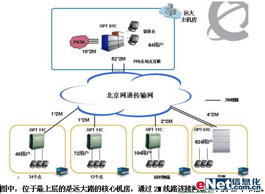在總體方案上,在遠大路核心機房部署的高性能交換機作為全網的核心;各個分支分別配置支持E1中繼上聯到核心交換機;但同時,各個分支也具備本地的獨立工作能力,即使在中繼線路出現故障的情況下,也能正常的工作。