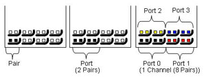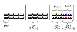 接口的最小連接單元。端口的兩對差分信號被映像成一收一發(fā)的傳輸模式。下圖描繪了一個(gè)差分對、一個(gè)埠、以及一個(gè)通路的針腳分布: