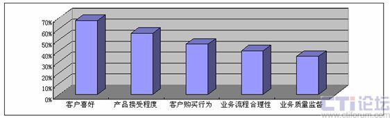 那么保險(xiǎn)企業(yè)希望通過(guò)進(jìn)一步深入開(kāi)展電話中心信息化工作得到哪些效用或者有價(jià)值的信息呢,我們認(rèn)為,電話中心為保險(xiǎn)企業(yè)所提供的信息中最重要的依然是“客戶的聲音”,具體來(lái)說(shuō),包括客戶喜好和客戶購(gòu)買行為等,其次便是業(yè)務(wù)流程信息。企業(yè)管理層對(duì)來(lái)自電話中心的不同信息的關(guān)注程度如下圖所示。