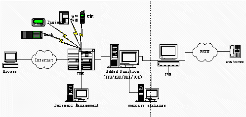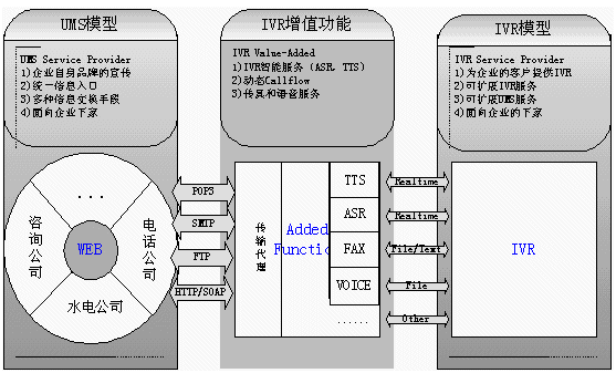 傳統(tǒng)UMS的分散的網(wǎng)民,而IVR, UMS服務(wù)提供商的客戶是企業(yè),系統(tǒng)的使用者則是企業(yè)的客戶(即系統(tǒng)面向下家,由下家為最終客戶提供服務(wù)),分離的模式可以有兩個(gè)獨(dú)立的企業(yè)來(lái)運(yùn)營(yíng)系統(tǒng),IVR Service由具有電信資源的企業(yè)(如:具有接入號(hào),有電信中繼資源,還有CTI系統(tǒng)建設(shè)經(jīng)驗(yàn))運(yùn)營(yíng)。UMS Service由ISP企業(yè),網(wǎng)站門(mén)戶企業(yè)等在互聯(lián)網(wǎng)絡(luò)有建設(shè)經(jīng)驗(yàn)的企業(yè)運(yùn)營(yíng)。兩家企業(yè)密切合作。共同提供完善的統(tǒng)一的信息服務(wù)。