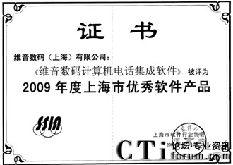CTI論壇(ctiforum)10月19日消息: 金秋十月,捷報頻傳,由上海市軟件行業(yè)協(xié)會開展的2009年度上海明星軟件企業(yè)評選結(jié)果出爐,維音數(shù)碼不僅榮登:“2009年度上海明星軟件企業(yè)(經(jīng)營型)”和“2009年度上海明星軟件企業(yè)(創(chuàng)新型)”獲獎榜單,維音數(shù)碼自主研發(fā)的軟件產(chǎn)品VisionCTI(計算機電話集成系統(tǒng))更是被評定為“2009年度上海市優(yōu)秀軟件產(chǎn)品獎”。