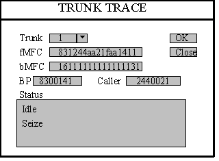 從trank下拉式選擇框中選中要跟蹤的中繼號,擊“OK”按鈕,則可以從status框中顯示中繼當前的狀態(tài),只顯示新出現(xiàn)的狀態(tài)轉(zhuǎn)變,對過去的狀態(tài)不顯示。