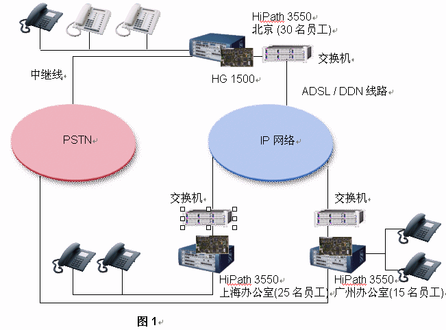 西門(mén)子推薦該公司每一個(gè)辦公室均采用HiPath 3550 PBX。如果,A公司每個(gè)辦公室已經(jīng)擁有DDN專(zhuān)線(xiàn)或ADSL連接至Internet,它就能將其內(nèi)部通信建設(shè)在現(xiàn)存的IP網(wǎng)絡(luò)的基礎(chǔ)之上。其集成網(wǎng)關(guān)HiPath 1500被用來(lái)連接數(shù)據(jù)網(wǎng)絡(luò)和語(yǔ)音網(wǎng)絡(luò)。在這樣的網(wǎng)絡(luò)架構(gòu)中,路由冗余能夠得到充足的保證,因?yàn)槲鏖T(mén)子HiPath解決方案提供了最大的網(wǎng)絡(luò)存活性:即使IP網(wǎng)絡(luò)出現(xiàn)故障,西門(mén)子網(wǎng)絡(luò)設(shè)置能夠?qū)⒙酚勺詣?dòng)切換至PSTN之上。