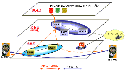 VPN等。圖中以移動(dòng)分組網(wǎng)的承載方式為例,描述了IMS用戶(hù)通過(guò)手機(jī)進(jìn)行IMS會(huì)話(huà)的方式,主要的承載層設(shè)備有SGSN、GGSN,以及媒體網(wǎng)關(guān)MGW。SGSN和GGSN可以完全重用現(xiàn)網(wǎng)設(shè)備,不需要硬件升級(jí),僅通過(guò)做相關(guān)配置就可以支持IMS了。MGW是負(fù)責(zé)媒體流在IMS域和CS域互通的功能實(shí)體,主要解決話(huà)音互通問(wèn)題。無(wú)論具體采用哪一種接入方式,只要基于IP技術(shù),所有的IMS用戶(hù)信令就可以很好地傳送到控制層。
