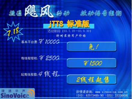 2003年7月18日,北京捷通華聲語音技術(shù)有限公司正式發(fā)布捷通華聲語音合成技術(shù) “jTTS標(biāo)準(zhǔn)版”。為慶!癹TTS標(biāo)準(zhǔn)版”的正式上市,為期近三個月,推廣“jTTS標(biāo)準(zhǔn)版”的捷通“颶風(fēng)行動”也在同一時間正式啟動! 捷通“颶風(fēng)行動”的宗旨--用全新的產(chǎn)品、全方位的服務(wù)、最具競爭力的價格與所有CTI領(lǐng)域的企業(yè)合作,開啟面向中小型CTI系統(tǒng)語音應(yīng)用的市場大門,為CTI產(chǎn)業(yè)發(fā)展提供持久動力支持!