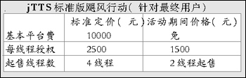 jTTS標(biāo)準(zhǔn)版在聲音質(zhì)量、聲音平滑度、自然度等方面已具有比較高的實(shí)用化水平。為了真正啟動(dòng)語音技術(shù)的應(yīng)用市場(chǎng),捷通華聲啟動(dòng)“颶風(fēng)行動(dòng)”,在活動(dòng)期間為最終客戶、系統(tǒng)集成商制定了一個(gè)極具競(jìng)爭(zhēng)力的價(jià)格,并且無平臺(tái)費(fèi)。這次活動(dòng)主要針對(duì)CTI領(lǐng)域中大量中小型系統(tǒng)的應(yīng)用開展此次活動(dòng),目的是讓先進(jìn)的技術(shù)能夠被更多的用戶采用,為系統(tǒng)集成商應(yīng)用TTS技術(shù)提供了很高的利潤空間。