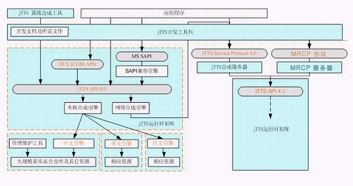 Programming Interface),即jTTS API 4.0,以及統一的多語種引擎管理模塊,即jTTS_ML.DLL。多語種的引擎(例如中文引擎jTTS_CH.DLL,英文引擎jTTS_EN.DLL等)在多語種引擎管理模塊的調度下進行實際的合成工作,而目前尚未提供的其他語種的引擎也可以方便地加入到這個體系結構中來。