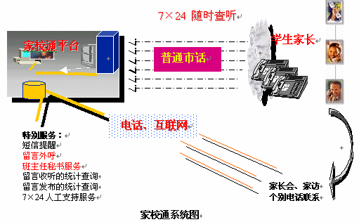 捷通華聲從關(guān)愛青少年成長(zhǎng)出發(fā),提出了應(yīng)用于教育領(lǐng)域溝通平臺(tái)"家校通"系統(tǒng)的語音服務(wù)解決方案。家校通系統(tǒng)是一個(gè)融合了語音合成、計(jì)算機(jī)網(wǎng)絡(luò)集成綜合服務(wù)、互聯(lián)網(wǎng)、數(shù)據(jù)庫(kù)等多種先進(jìn)IT技術(shù)為一體的新一代家校聯(lián)系工具。它充分利用互聯(lián)網(wǎng)與目前最為普及的公眾電話等資源,為學(xué)校提供多樣化的信息發(fā)布渠道,同時(shí)強(qiáng)大的7×24小時(shí)的留言發(fā)布和查聽服務(wù)功能,為老師和家長(zhǎng)提供一種全新、高效、便捷的交流方式,大大提高了家長(zhǎng)的滿意度,提升了學(xué)校的管理實(shí)力。