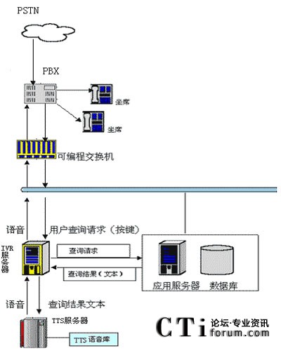 用戶可以通過(guò)電話提交他的查詢請(qǐng)求(比如使用按鍵方式,提交個(gè)人卡號(hào)等),IVR服務(wù)器收到請(qǐng)求后會(huì)向其他應(yīng)用服務(wù)器提交此查詢請(qǐng)求,當(dāng)IVR得到查詢結(jié)果后,他會(huì)將文本形式的查詢結(jié)果交給jTTS服務(wù)器,jTTS服務(wù)器會(huì)返回查詢結(jié)果的語(yǔ)音形式,最終語(yǔ)音會(huì)在坐席上播放,用戶就可以聽到他剛才所要查詢的信息。