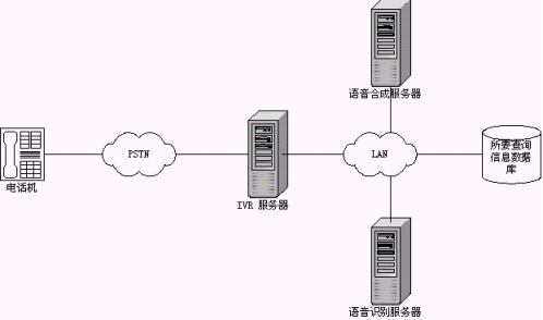 這種模式是最常見(jiàn)的一種接入情況。將原有煩瑣的按鍵式提示改成更具人性化的交談式語(yǔ)音交互,類(lèi)似于語(yǔ)音門(mén)戶(hù)模式。這是目前大家普遍認(rèn)同的一種語(yǔ)音識(shí)別技術(shù)應(yīng)用方式。相比原有的按鍵方式,系統(tǒng)的新穎程度、個(gè)性化程度、用戶(hù)操作的方便程度等都得到了極大的提高,如語(yǔ)音識(shí)別技術(shù)在股票查詢(xún)中的成功應(yīng)用,在點(diǎn)歌系統(tǒng)中的成功應(yīng)用等;另外利用語(yǔ)音識(shí)別技術(shù)也解決了一些原有系統(tǒng)無(wú)法實(shí)現(xiàn)的技術(shù)難題,如火車(chē)時(shí)刻查詢(xún)、機(jī)場(chǎng)航班查詢(xún)等,原有系統(tǒng)借助郵政編碼、電話(huà)區(qū)號(hào)等的方式讓人無(wú)所適從,現(xiàn)在直接和系統(tǒng)交談,順利獲取所需信息,可以說(shuō)是語(yǔ)音識(shí)別技術(shù)一個(gè)成功的應(yīng)用。這種系統(tǒng)的拓?fù)浣Y(jié)構(gòu)如下圖示: