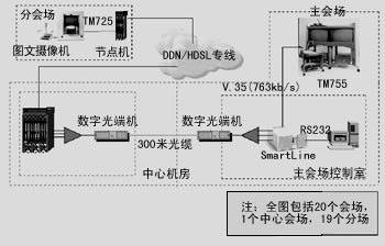 整個網(wǎng)絡(luò)采用輻射型星型網(wǎng)絡(luò)結(jié)構(gòu),共有21個網(wǎng)點。省公安廳為主控匯接點,對上連接公安部,對下可以管理控制多達(dá)20個市地級公安機(jī)關(guān),組成全省公安機(jī)關(guān)會議電視系統(tǒng)。公安部與省公安廳之間則利用衛(wèi)星通信信道傳輸,省公安廳至各市地級公安局采用768kbps的DDN信道傳輸。省廳端DDN節(jié)點機(jī)提供10個合路2Mbps 的E1接口,加開光端機(jī),經(jīng)由300米光纜傳輸至省公安廳電視會議控制室。