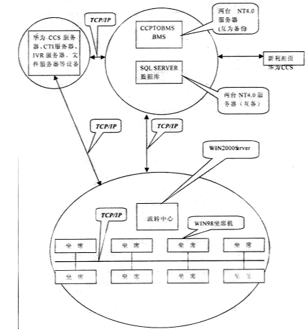 系統(tǒng)采用總部集中模式,前臺(tái)運(yùn)行信雅達(dá)通訊轉(zhuǎn)接程序(CCPTOBMS)和信雅達(dá)業(yè)務(wù)處理程序(BMS)。通訊轉(zhuǎn)接程序從華為接入平臺(tái)接收各類(lèi)業(yè)務(wù)請(qǐng)求,再轉(zhuǎn)發(fā)至業(yè)務(wù)處理程序。業(yè)務(wù)處理程序與新利處理中心通訊,將各類(lèi)業(yè)務(wù)請(qǐng)求分類(lèi)處理。后臺(tái)數(shù)據(jù)庫(kù)選用兩臺(tái)服務(wù)器安裝SQLSERVER7.0,使用OCTOPUS進(jìn)行數(shù)據(jù)備份。