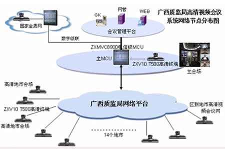 憑借全面的融合通信產(chǎn)品和解決方案、豐富的電子政務工程建設和實施經(jīng)驗,中興通訊為廣西“金質(zhì)工程”(一期)系統(tǒng)“量身定做”出一整套基于IP融合、使用方便靈活的解決方案:將整個系統(tǒng)分為兩個部分,即區(qū)質(zhì)監(jiān)局一級節(jié)點信息中心、各地市質(zhì)監(jiān)局及相關研究機構(gòu)共計15個二級節(jié)點信息中心,在管理上體現(xiàn)垂直的系統(tǒng)架構(gòu)。整個網(wǎng)絡可以看作一個分級的星形網(wǎng)絡,結(jié)構(gòu)簡單、易于擴展。