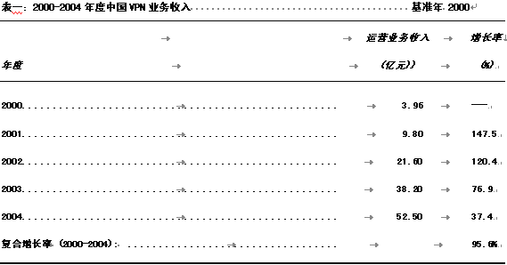 2000年,中國VPN運(yùn)營業(yè)務(wù)收入為人民幣3.96億元,主要業(yè)務(wù)提供商為新興的電信運(yùn)營商如網(wǎng)通、吉通、聯(lián)通等公司,以及數(shù)量可觀的或明或暗的網(wǎng)絡(luò)公司,VPN用戶主要集中在規(guī)模較大的外企、金融領(lǐng)域以及與IT相關(guān)的企業(yè)之中。隨著更多的虛擬運(yùn)營商進(jìn)入VPN服務(wù)市場,以及企業(yè)成本意識的不斷增強(qiáng),VPN用戶群體已經(jīng)呈擴(kuò)散之勢,制造業(yè)、FMCG連鎖經(jīng)營業(yè)、酒店業(yè)等已經(jīng)迅速進(jìn)入這一市場。預(yù)計(jì)到2004年度,國內(nèi)VPN業(yè)務(wù)收入可以達(dá)到52.5億元人民幣,年復(fù)合增長率為95.6%。各年度測算數(shù)據(jù)見表一。