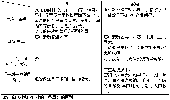 聯(lián)想長期構(gòu)筑的、在中國PC制造業(yè)的核心競(jìng)爭(zhēng)力,正受到戴爾的巨大威脅,導(dǎo)致聯(lián)想開始轉(zhuǎn)而采用戴爾的按客戶需求定制、直接銷售的模式,希望建立新的核心競(jìng)爭(zhēng)力,再度引領(lǐng)中國PC產(chǎn)業(yè)。IT制造業(yè)的巨變,戴爾的成功給陷于低層次競(jìng)爭(zhēng)的家電產(chǎn)業(yè)很大的啟發(fā),曾經(jīng)鑄造中國家電企業(yè)輝煌的核心競(jìng)爭(zhēng)力急需注入新的生命力,以適應(yīng)新的競(jìng)爭(zhēng)形勢(shì)。計(jì)算機(jī)技術(shù)、互動(dòng)通信技術(shù)的進(jìn)步以及互聯(lián)網(wǎng)的出現(xiàn)使企業(yè)能夠建立與用戶之間一對(duì)一的密切客戶關(guān)系,使服務(wù)創(chuàng)造價(jià)值,IT技術(shù)推動(dòng)技術(shù)、產(chǎn)品、生產(chǎn)、銷售和營銷的發(fā)展,支撐家電企業(yè)建立新的核心競(jìng)爭(zhēng)力。在同質(zhì)化競(jìng)爭(zhēng)的環(huán)境下,家電企業(yè)也許更應(yīng)該從服務(wù)、營銷、銷售方面來建立自己的核心競(jìng)爭(zhēng)力。海爾就是典型的例子,海爾的發(fā)展與它完善的服務(wù)體系和服務(wù)制度是分不開的。聚焦于服務(wù)、營銷、銷售的客戶關(guān)系管理(CRM)系統(tǒng)讓家電企業(yè)看到了新的希望?梢灶A(yù)言,CRM將為家電業(yè)點(diǎn)燃一盞新啟航燈。