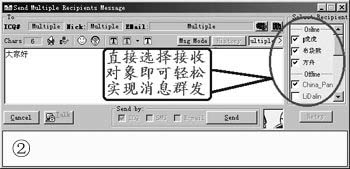 MSN與ICQ都有消息群發(fā)功能。但MSN只能通過“邀請其他聯(lián)系人加入”的方式進行,而且有最多加入四人(共五人)的限制。但ICQ的消息群發(fā)功能卻很強大。在對話模式下,單擊“Multiple”即可展開所有好友的列表。沒有人數(shù)限制,也沒有在線與否的限制(如圖2)。