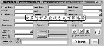 任何一款免費軟件的使用過程中,都會被強制地安插進一些廣告內(nèi)容,ICQ也不例外。對于這一點,財大氣粗的微軟做得很好。無論是Windows XP中捆綁的MSN,還是網(wǎng)上免費下載的,幾乎看不到廣告的影子。另外,即使在最新的ICQ2002a中,似乎仍然不能支持網(wǎng)絡(luò)攝像機和視頻聊天等功能,而這些功能在即時通訊領(lǐng)域幾乎成了必備的功能。不過,ICQ中強大的查找好友功能,使你只需記住好友的哪怕是一點點信息,就可以輕松找到這位好友,令任何一款即時通訊軟件都望塵莫及(如圖3)。新版2002a中還新增了服務(wù)器保存好友信息的功能,使得在世界任何一個角落都可以及時方便地與好友進行聯(lián)絡(luò)。