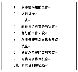10. 來自公司高層的認(rèn)可。這是一個(gè)非常有效的作法,能得到公司高層的認(rèn)可對(duì)很多人來說,是一生都可以值得回憶的事情。如果在一家全球的大公司,和公司CEO共同進(jìn)餐,得到公司CEO的親筆信,和CEO合影等都是非常高的榮譽(yù)。當(dāng)然,這個(gè)作法不是可以經(jīng)常用的。因?yàn),如果用得太?jīng)常了,就可以失去了一種"神秘感"或"來之不易"的感覺。