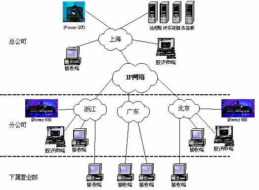 某證券公司有三級網(wǎng)絡(luò),總公司、分公司和下屬營業(yè)部?偣镜椒止編捠2M,在總公司配置一套會議室型電視會議終端POLYCOM 970和一套多點會議服務(wù)器Radvision ViaIP400。在分公司配置了38套會議室型電視會議終端POLYCOM 680,用于與總公司進(jìn)行雙向視頻會議。分公司到營業(yè)部帶寬是512K,各營業(yè)部安裝遠(yuǎn)程股評系統(tǒng)接收端程序,遠(yuǎn)程股評系統(tǒng)服務(wù)器都放置在海通總公司。當(dāng)在總公司進(jìn)行股評時,總公司本地攝像頭拍攝教師畫面,MIC采集教師聲音,傳給服務(wù)器編碼,再通過網(wǎng)絡(luò)供各個接收端接收;當(dāng)在分公司進(jìn)行股評時,首先分公司的電視會議設(shè)備采集教師畫面及聲音傳回總公司的電視會議設(shè)備,再傳給遠(yuǎn)程股評系統(tǒng)的服務(wù)器進(jìn)行編碼,然后通過網(wǎng)絡(luò)發(fā)布,供接收端接收。(結(jié)構(gòu)如下圖)