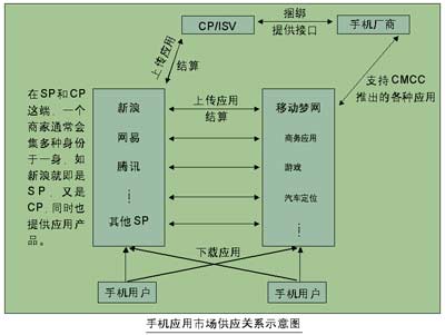 在這樣一個全新的銷售模式下,運營商的作用也越發(fā)凸顯出來!皦艟W(wǎng)是一個大的平臺,SP是個小平臺,SP再通過與CP建立合作,進(jìn)而將整個應(yīng)用市場與終端連接起來,F(xiàn)在,我們?nèi)康膽?yīng)用都放到夢網(wǎng)上面了!北本﹫笸娮由虅(wù)公司的一個工作人員說。移動夢網(wǎng)的建立,事實上在手機廠商、應(yīng)用開發(fā)商、用戶三者之間搭了一個橋梁,將各種手機應(yīng)用集中在一個門戶網(wǎng)站,用戶需要時,只需登陸到夢網(wǎng)上面,點擊相關(guān)的網(wǎng)頁,就可隨時下載所需要的應(yīng)用。