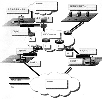 鑒于客戶是通信公司,有較強(qiáng)的系統(tǒng)管理能力,而且要求視訊和數(shù)據(jù)出口分開(kāi),視訊出口在北京,可以和VPN線路走相同的物理鏈路,不會(huì)造成路由設(shè)計(jì)上的問(wèn)題,故將NAT放在客戶公司總部,由用戶自己管理,增加DIA出口和費(fèi)用。網(wǎng)絡(luò)通信拓?fù)鋱D如右所示。