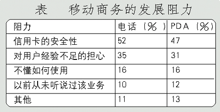 手機(jī)支付業(yè)務(wù)的進(jìn)一步發(fā)展主要受制于用戶對(duì)該項(xiàng)業(yè)務(wù)的接受程度。Forrester研究公司的研究表明,超過(guò)一半的被訪者認(rèn)為信用卡的安全性是移動(dòng)商務(wù)發(fā)展的主要阻力。(調(diào)查結(jié)果見下表)