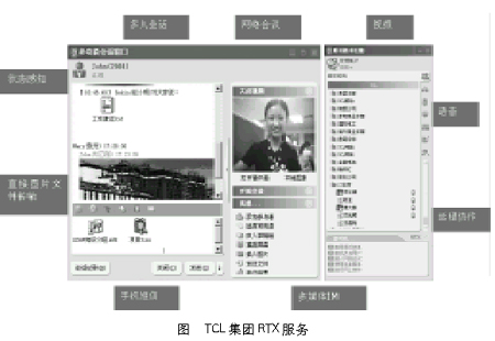 RTX產(chǎn)品支持標準的SIP、H.323 IP電話協(xié)議,并采用高質(zhì)量的QoS技術(shù)保證實時通信網(wǎng)絡(luò)質(zhì)量,使得TCL集團公司的用戶可以與同事之間采用語音或者視頻的面對面的交流(如圖),相當于給集團公司的任何一位RTX用戶配備了一部集成的視頻和語音電話。目前這項服務(wù)在集團公司非常受歡迎,尤其是遠程的代表處和集團總部之間的信息交流更直接、更快捷,在一定程度上取代了電話的功能,大大節(jié)約了通信費用。比如,TCL空調(diào)的計劃部每天需要和全國20多個代表處的計劃處進行數(shù)據(jù)往來,以前需要電話完成的功能現(xiàn)在通過RTX的即時文字、短信和語音對講完成,大大提高效率,節(jié)省了通信成本。