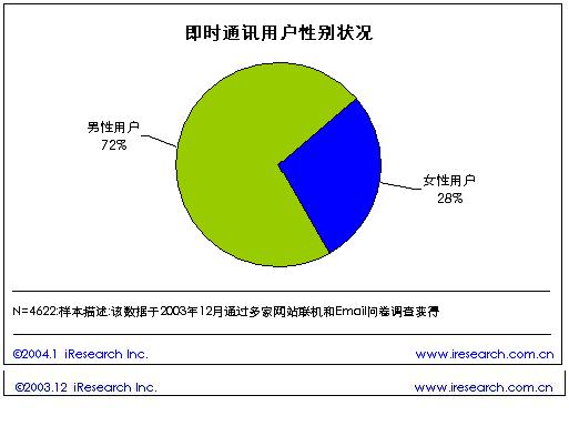 根據艾瑞市場咨詢(iResearch)的《2003年中國即時通訊研究報告》研究結果表明,在中國的即時通訊用戶中,72%的即時通訊用戶為男性,占據了大部分份額。女性用戶僅僅占28%?磥砟行跃W民更喜歡在網上聊天。