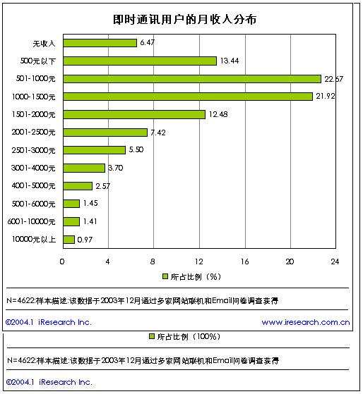 從收入情況來看,即時通訊用戶仍然以低收入為主,其中月收入低于1500元的用戶比例高達64.5%,這可能與使用即時通訊的用戶主要是學生和普通公司職員的緣故。