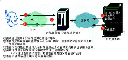 由于電話(包括很多蜂窩電話)沒有計算功能,無法管理語音瀏覽器,所以語音瀏覽器駐留在網(wǎng)絡(luò)上的語音服務(wù)器中。語音服務(wù)器可以位于企業(yè)數(shù)據(jù)中心,或者位于主管供應(yīng)商處。用戶撥叫一臺語音服務(wù)器,該服務(wù)器從一臺應(yīng)用服務(wù)器上下載VoiceXML 2.0腳本、語法格式和聲音文件。語音瀏覽器以一種語音信息的形式將VoiceXML 2.0腳本翻譯給用戶聽,語音信息可以是預(yù)先錄制的語音,或經(jīng)由一個文本語音合成器產(chǎn)生的文本。然后語音瀏覽器調(diào)用一個自動語音識別(ASR)軟件,使用語法格式來識別出用戶響應(yīng)的語音詞匯。