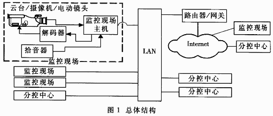 遠程監(jiān)控系統(tǒng)一般包括三部分:前端監(jiān)控現(xiàn)場、通信設(shè)備和后端分控中心。整個系統(tǒng)基于Client/Server(客戶機/服務(wù)器)模式。總體結(jié)構(gòu)如圖1所示。