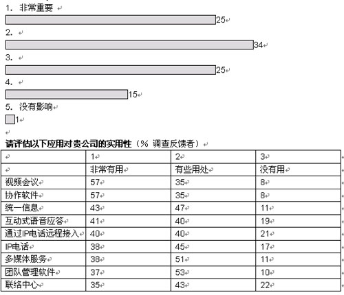 我們調(diào)查的企業(yè)中,有超過(guò)三分之二將在未來(lái)五年內(nèi)實(shí)現(xiàn)大多數(shù)或者所有部門(mén)向融合網(wǎng)絡(luò)的轉(zhuǎn)型。大部分企業(yè)采取按部就班的形式在某些特殊部門(mén)和業(yè)務(wù)開(kāi)始部署。在融合應(yīng)用中,IP語(yǔ)音電話將在未來(lái)三年內(nèi)吸引大量投資;管理人士期望通過(guò)大幅削減公司內(nèi)部的通話費(fèi)用獲得早期的回報(bào)。在更廣泛的層面上,大多數(shù)管理者預(yù)計(jì),融合網(wǎng)絡(luò)對(duì)其企業(yè)的商業(yè)影響將會(huì)“非常重要”或者“重要”。