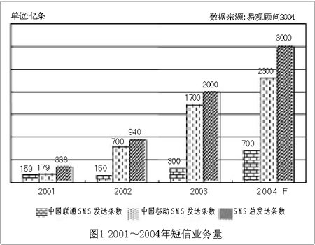 預(yù)計2004年的短信發(fā)送量將達(dá)到3000億條,其中中國移動為2300億條,中國聯(lián)通為700億條,具體如圖1所示。并且,隨著用戶逐漸習(xí)慣使用SMS業(yè)務(wù),SMS用戶數(shù)占手機(jī)用戶數(shù)的比例會略有增加。
