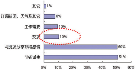 首先從使用目的看,我們的調(diào)查研究表明,大部分用戶使用短信最主要的目的是節(jié)省話費(fèi),該類用戶比例高達(dá)51%; 其次是與朋友分享,以及聯(lián)絡(luò)感情,比例為50%; 而其他如交友、工作需要、訂閱新聞、天氣及其他等所占比例較低,均不超過10%。由此可見,雖然短信業(yè)務(wù)已經(jīng)深入地滲透了用戶的生活,但是用戶的主要應(yīng)用仍然是點對點的應(yīng)用,信息類的應(yīng)用只占很小的部分(見圖2)。