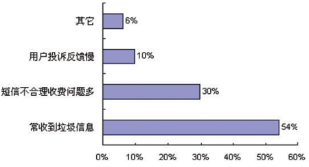 調(diào)研結(jié)果顯示,用戶對目前經(jīng)常收到垃圾信息表示不滿比例高達(dá)54%;其次是短信費(fèi)用問題,用戶的不滿意見也比較多,例如短信的訂閱與退訂,對于一些短信費(fèi)用的不合理收取、一些訂閱業(yè)務(wù)無法取消等等,該比例為30%;另外有10%左右的用戶對解決投訴的及時性和有效性表示了不滿。