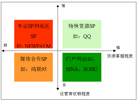 通過提供網(wǎng)絡(luò)服務(wù)產(chǎn)生強(qiáng)大流量帶動無線業(yè)務(wù)發(fā)展,業(yè)務(wù)收入主要來源網(wǎng)站推廣,產(chǎn)品常圍繞自有網(wǎng)絡(luò)內(nèi)容策劃、主要收入來自圖鈴、社區(qū)等網(wǎng)絡(luò)特點(diǎn)鮮明的業(yè)務(wù):搜狐、新浪、網(wǎng)易、TOM;