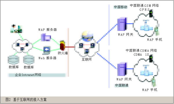 如圖2所示,本方案適用于已經(jīng)有基于互聯(lián)網(wǎng)架構(gòu)Web應(yīng)用部署的中小型企業(yè),企業(yè)只需在安裝Web服務(wù)器的位置再設(shè)置一臺WAP服務(wù)器即可(為了節(jié)約成本,WAP服務(wù)器甚至可以直接部署在Web服務(wù)器上),并不需要改變現(xiàn)有網(wǎng)絡(luò)的拓?fù)浣Y(jié)構(gòu),也不用關(guān)心用戶的連接方式,企業(yè)并不參與中國移動(中國聯(lián)通)內(nèi)部數(shù)據(jù)網(wǎng)絡(luò)與互聯(lián)網(wǎng)的網(wǎng)絡(luò)聯(lián)接,具有投資省、部署快、易維護(hù)的特點。網(wǎng)絡(luò)安全性依賴于與互聯(lián)網(wǎng)相連的防火墻的可靠性,安全性能中等。