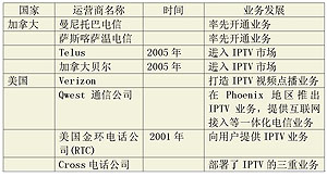 在北美IPTV市場(chǎng),加拿大傳統(tǒng)電信公司走在前面。美國(guó)的IPTV業(yè)務(wù)是由電視運(yùn)營(yíng)商開始推出的,現(xiàn)在已實(shí)現(xiàn)了數(shù)據(jù)、語音、多媒體三重業(yè)務(wù)整合目標(biāo)。獨(dú)立本地運(yùn)營(yíng)商開展了DSL網(wǎng)絡(luò)和光纖網(wǎng)絡(luò)上的IPTV業(yè)務(wù)。2004年10月,美國(guó)三家主要的電信運(yùn)營(yíng)商RBOC—SBC、南方貝爾和Verizon公開了IP視頻計(jì)劃,開始在美國(guó)大規(guī)模部署IPTV網(wǎng)絡(luò)。RBOC—SBC已計(jì)劃2005年全面進(jìn)入IPTV市場(chǎng)。目前,美國(guó)幾乎所有大的電話公司都在致力于開發(fā)IPTV服務(wù)。