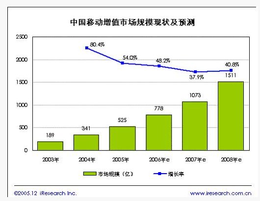 隨著中國(guó)移動(dòng)電話(huà)用戶(hù)的不斷增長(zhǎng)和移動(dòng)增值服務(wù)的不斷發(fā)展創(chuàng)新,移動(dòng)增值服務(wù)已經(jīng)成為現(xiàn)隨著市場(chǎng)的發(fā)展和不斷規(guī)范,中國(guó)移動(dòng)增值服務(wù)市場(chǎng)將進(jìn)入相對(duì)平穩(wěn)的發(fā)展階段。據(jù)iResearch預(yù)測(cè),中國(guó)移動(dòng)增值服務(wù)的市場(chǎng)規(guī)模增長(zhǎng)速度將逐年減緩,到2008年受奧運(yùn)會(huì)影響增長(zhǎng)速度提高,規(guī)模將突破1500億元。